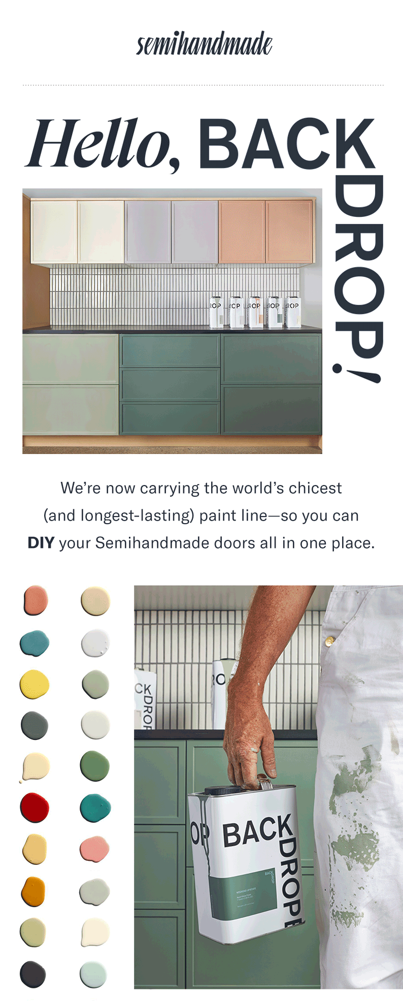 Your dream kitchen, made easy. At Semihandmade we joined forces with Backdrop Paint to deliver a curated range of modern cabinet colors — perfectly matched to our DIY doors and designed to elevate any space. Because a bold kitchen starts with the right palette.